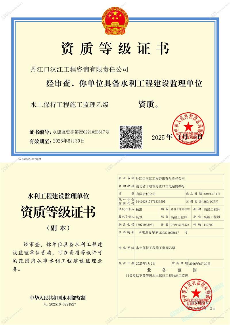 (原漢江綜合開發(fā)公司水利水電監(jiān)理中心)成立于 1989年3月,1993年6月經(jīng)水利部審批成為首批注冊監(jiān)理單位 (隸屬于長江水利委員會), 注冊資本 360萬元 。公司位于湖北省十堰市丹江口市電站路。公司目前擁有水利部頒發(fā)的 水利工程施工監(jiān)理甲級 、 水土保持工程施工監(jiān)理 乙 級 資質(zhì) ;住建部頒發(fā)的 房屋建筑 、 市政公用工程監(jiān)理 乙 級資質(zhì) 。 可獨(dú)立承擔(dān) 各類水利水電工程 、 一般工業(yè)與民用建筑工程監(jiān)理 , 土地整治 , 招標(biāo)代理 、 技術(shù)咨詢 等業(yè)務(wù)。公司實(shí)行董事會領(lǐng)導(dǎo)下的總經(jīng)理負(fù)責(zé)制,下設(shè)辦公室、經(jīng)營部、財(cái)務(wù)部、工程技術(shù)部等職能部門。……